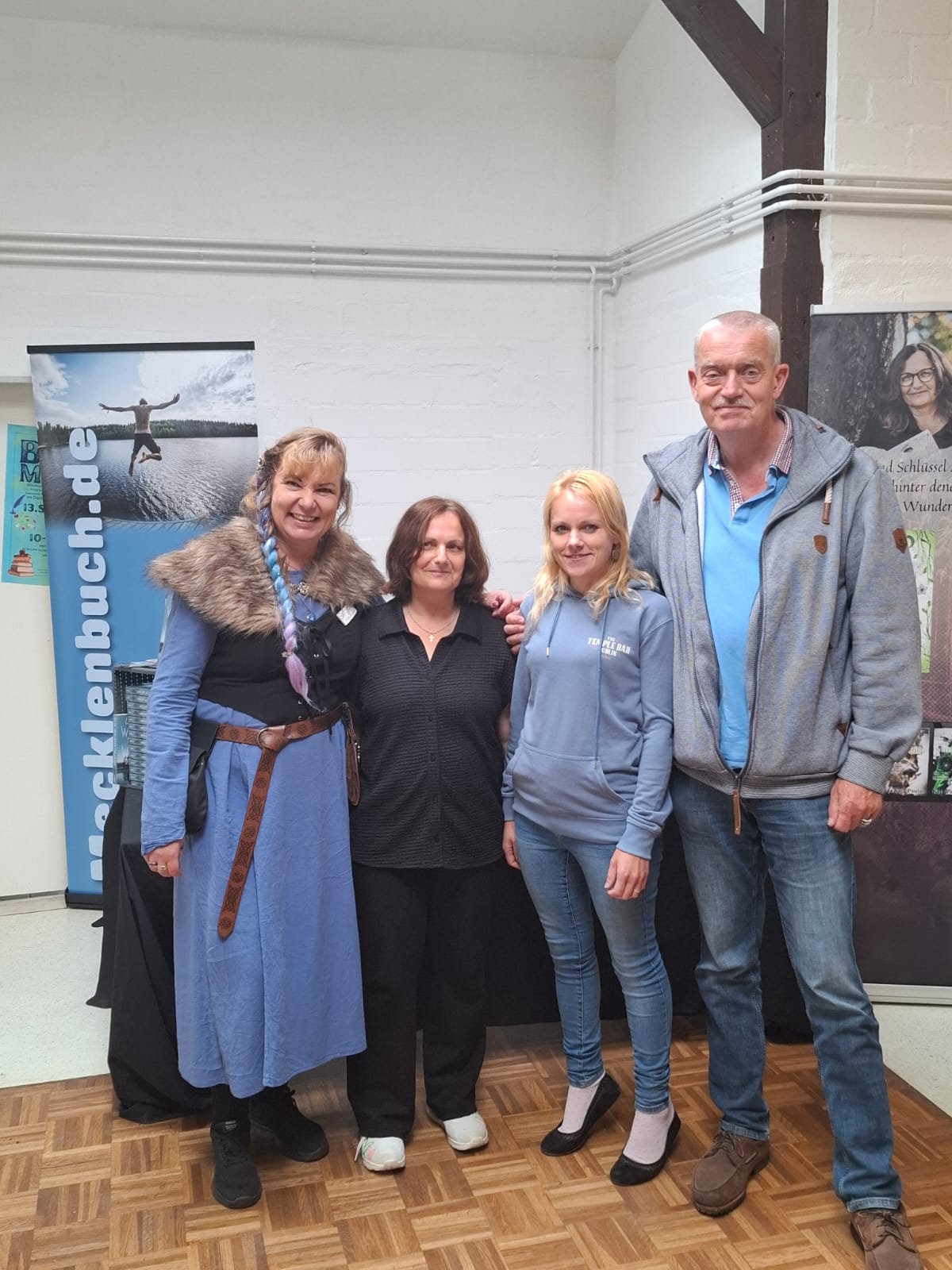 Auf dem Foto vier Buchmesseen in Mecklenburg-Vorpommern: Sabine Reifenstahl (PabuCo, Parchim), Kaja Paulan (Tessin), Rebekka Jost (Krembz), Siebo Woydt (Krakow am See), vlnr.