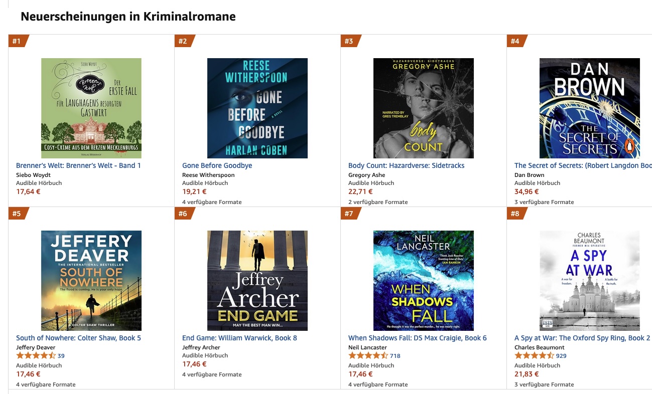 Das Hörbuch war am 20. Mai 2025 auf Platz 1 der amazon-Hörbuch-Charts "Neuerscheinungen Kriminalromane" und hielt sich die nächsten 8 Wochen unter den Top-10