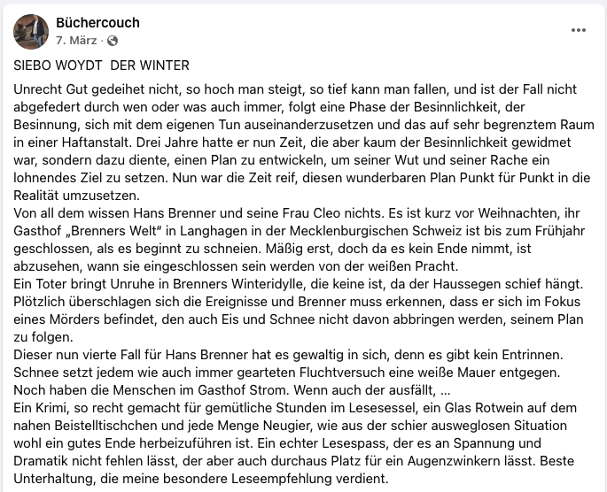 Hans Brenner hat sich so sehr auf ein ruhiges Weihnachtsfest gefreut. Seine Gastwirtschaft ›Brenner’s Welt‹ im Örtchen Langhagen in der Mecklenburgischen Schweiz ist bis zum Frühjahr geschlossen, das Dorf liegt im Winterschlaf und die Angestellten haben Urlaub. Nur der Haussegen hängt schief, seine Frau Cleo hat aus Brenners Sicht etwas Undenkbares getan. Draußen fällt erster Schnee, dann fällt sehr viel Schnee, dann bricht der Winter mit voller Macht herein.