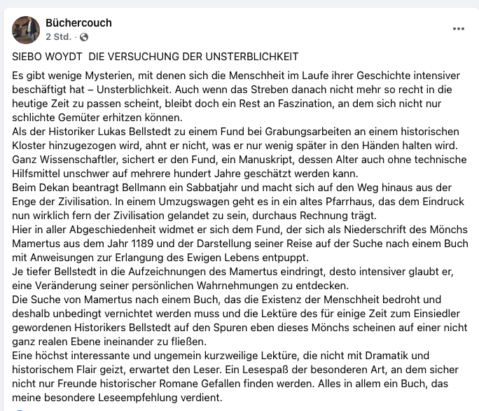 »Der Historiker Lukas Bellstedt findet in einem Kloster nahe Braunschweig die Aufzeichnungen des Mönches Mamertus, der im Jahr 1189 mit einem Ritter in das heidnische Mecklenburg aufbricht, um ein verschollenes Buch zu suchen und zu vernichten. In dem Buch soll ein Ritual beschrieben sein, mit dem man unsterblich wird. Bellstedt hält es für das gefährlichste Buch der Welt. Bellstedt verfolgt in den Aufzeichnungen die Abenteuer der beiden ungleichen Männer auf ihrem Weg vom Harz bis nach Dargun in Mecklenburg und liest von Mamertus’ Entzifferung des Buches des Ewigen Lebens. Dann zwingt der Ritter den Mönch, das Ritual der Unsterblichkeit zu vollziehen … «